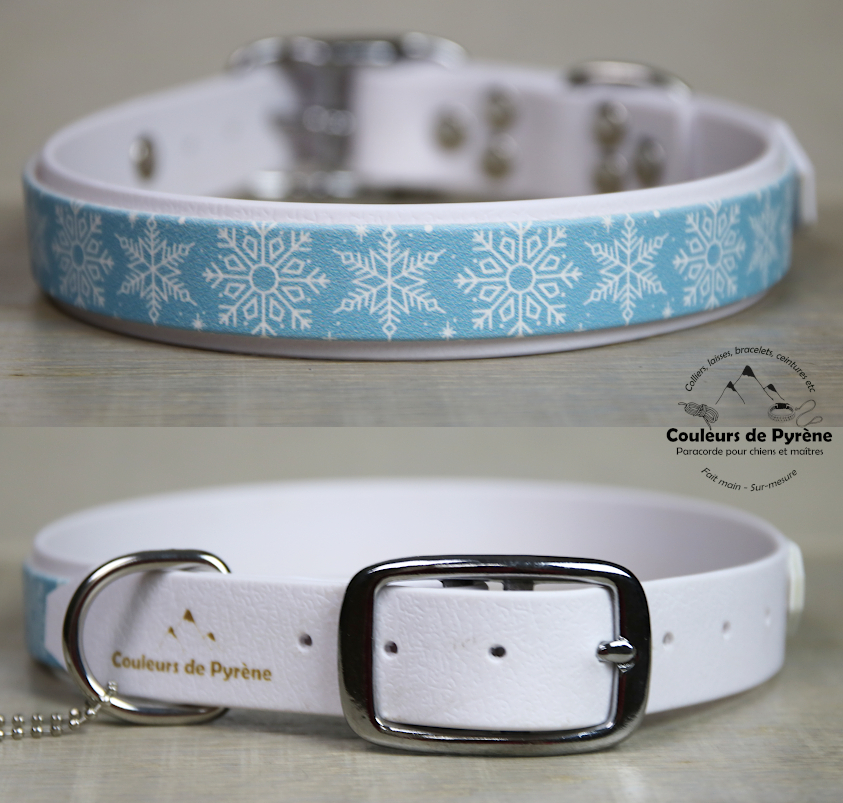 Collier bicolore blanc et bleu clair, en BIOTHANE®, avec impression flocons.