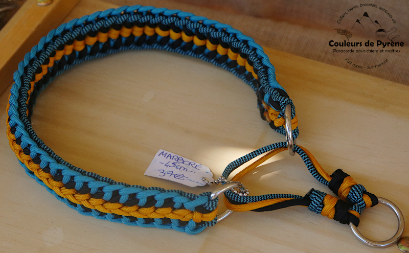 Fermeture système martingale : facile à enfiler/retirer, se resserre sans étrangler dès qu’il y a de la traction (voir explications) et très résistant (pas de boucle), voire photo 3