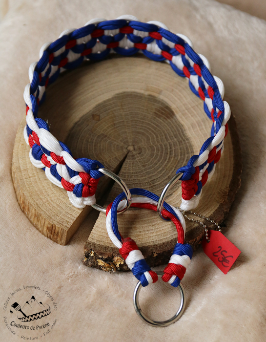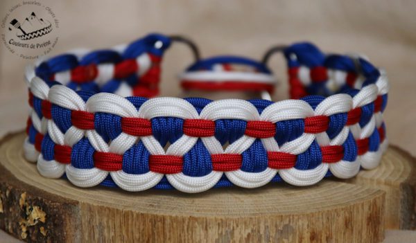 Collier en paracorde motif PIMENE (MEDIUM), couleur bleu, blanc et rouge.