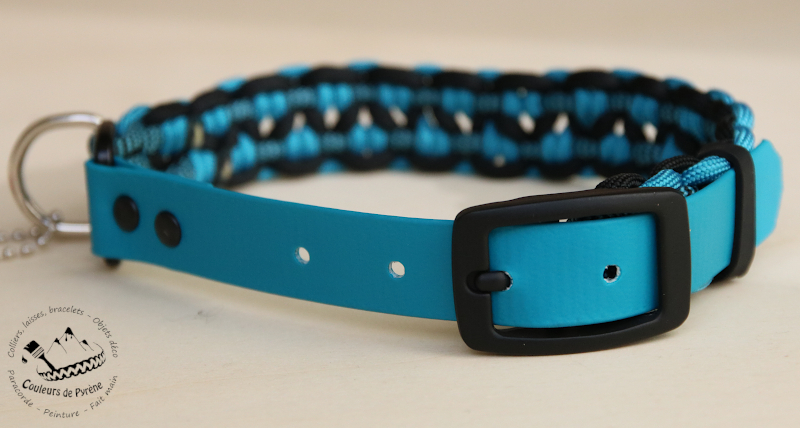 Collier en paracorde motif PIMENE-MINI (catégorie MINI), couleur bleu turquoise et noir.