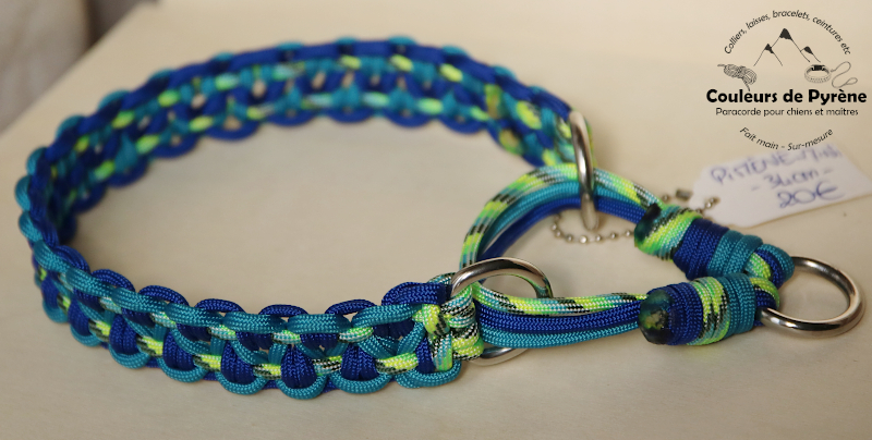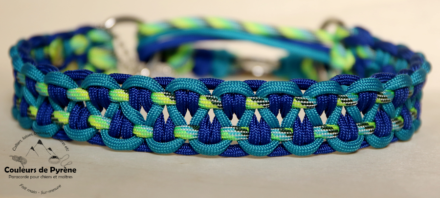 Collier en paracorde motif PIMENE-MINI (catégorie MINI), couleur bleu roi, turquoise, vert fluo.