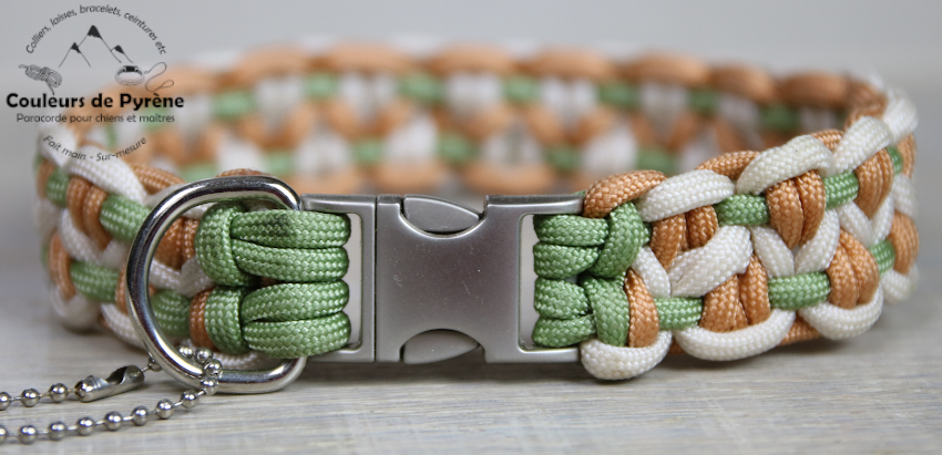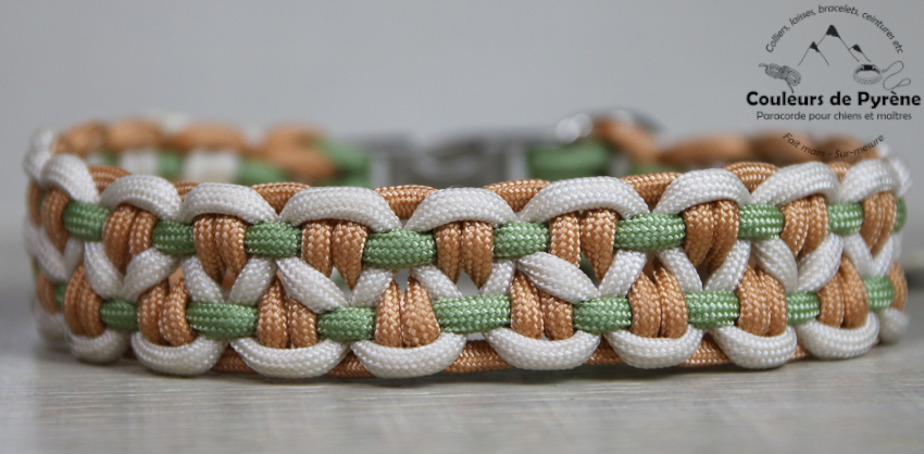 Collier en paracorde motif PIMENE-MINI (catégorie MINI), couleur crème, cuivre, vert amande.