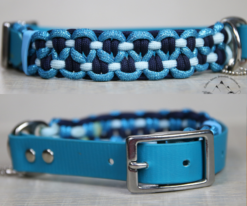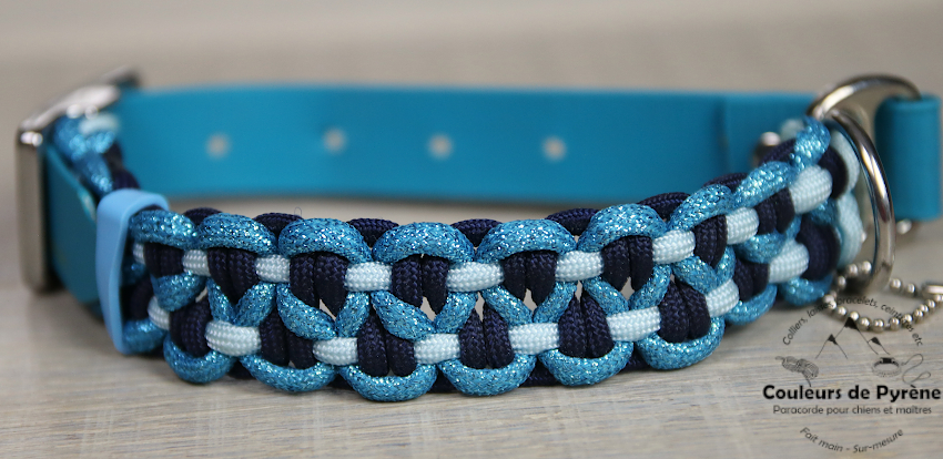 Collier en paracorde motif PIMENE-MINI (catégorie MINI), couleur turquoise avec paillettes, bleu marine.