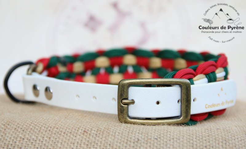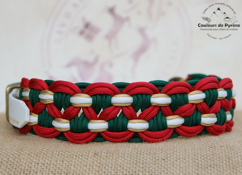 Collier en paracorde, motif PIMENE (MEDIUM), coloris de Noël : vert, rouge, blanc, or.