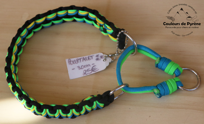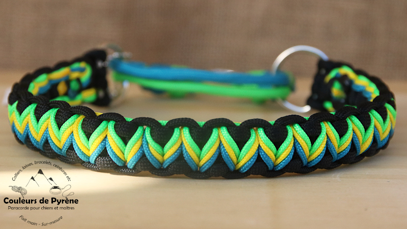 Collier en paracorde motif POURTALET 3* en paracorde standard et paracorde fine (catégorie MINI), couleur noir, turquoise, jaune, et vert.
