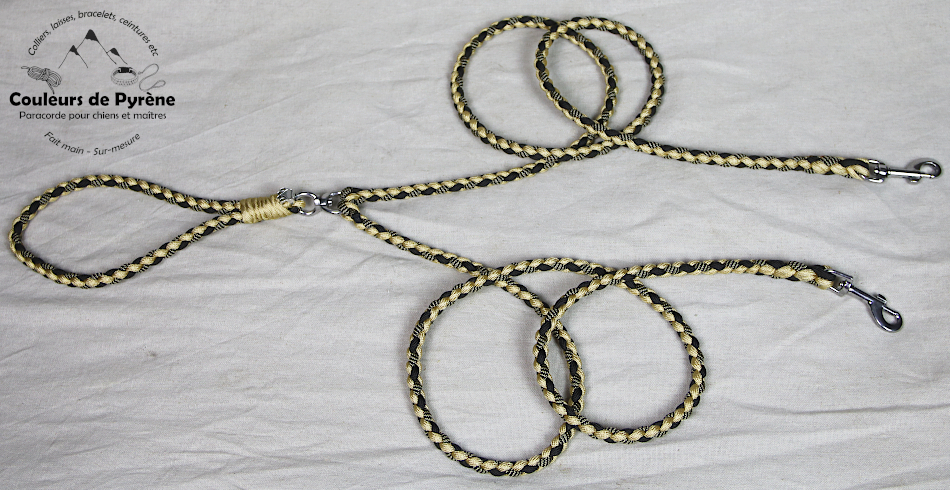 Une seule poignée reliée à 2 laisses, pour 2 chiens. Un émérillon permet l’indépendance de mouvements de chacun des chiens (et évite les noeuds !), voir photo 2.