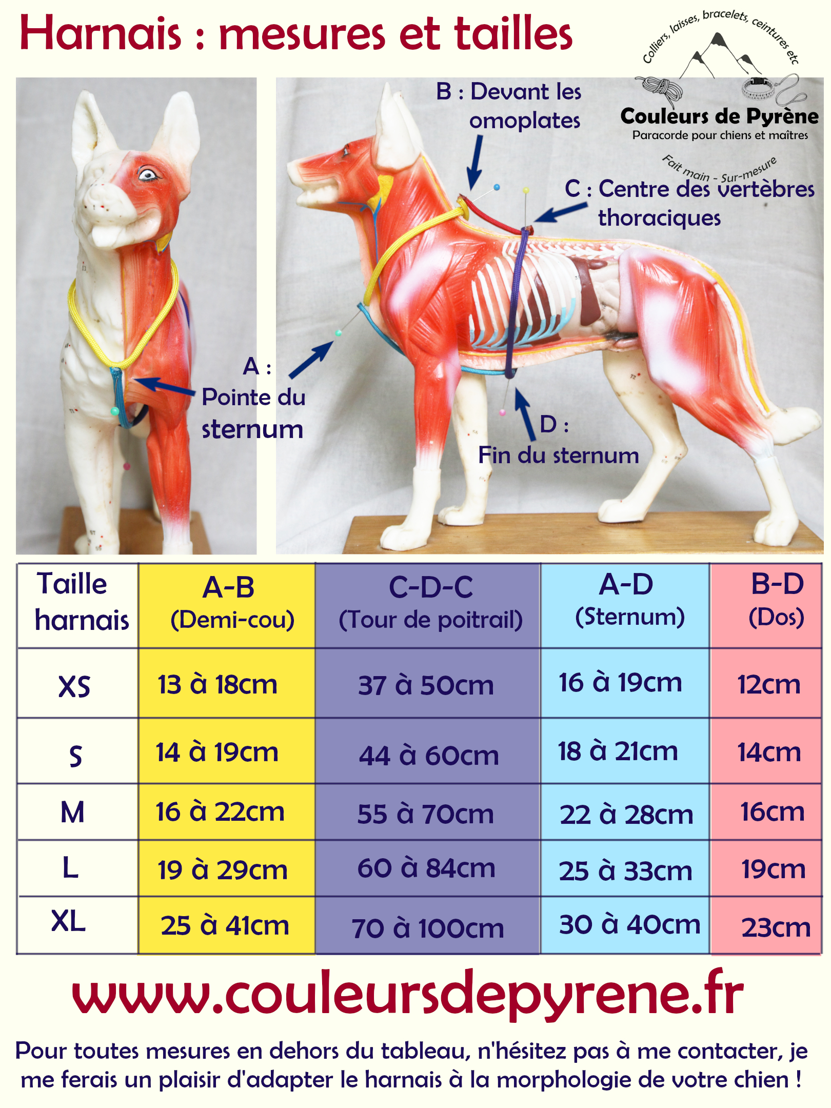 Guide des Tailles (détails dans galerie photos) : PS : les harnais étant fait à la main, une variation de +/- 1cm est possible XS :