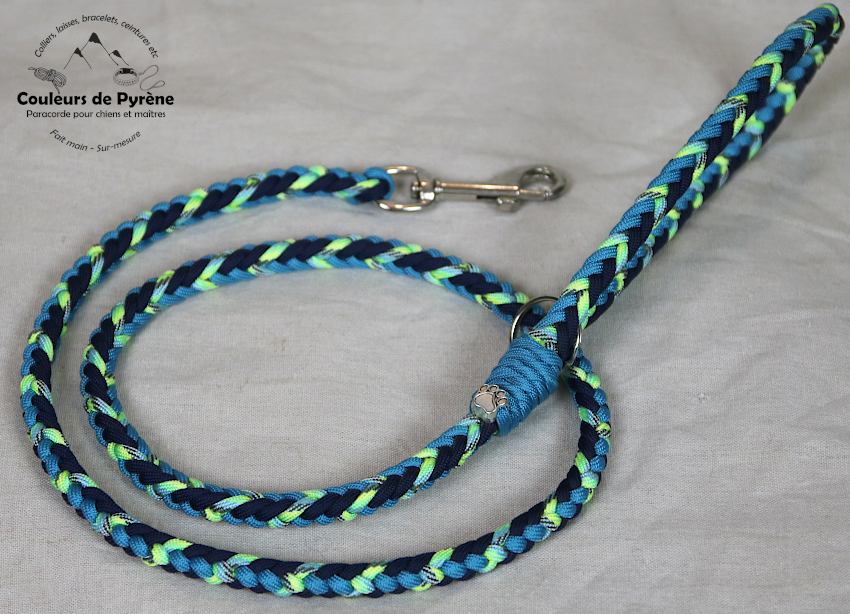 Laisse motif BASSIA, catégorie MEDIUM, couleurs bleu marine, turquoise, vert fluo.