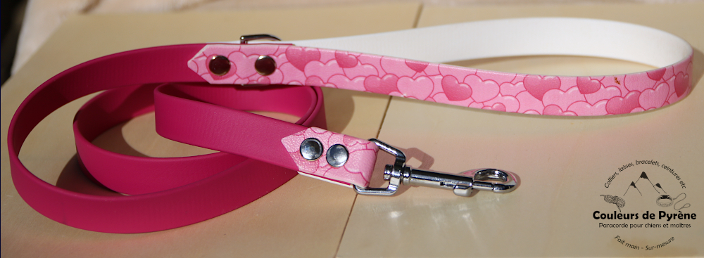 La poignée et la zone du mousqueton sont en BIOTHANE imprimée coeurs, la partie centrale est unie (couleur au choix), pour faire ressortir le motif ou s’harmoniser avec.