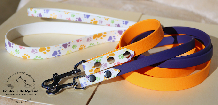 La poignée et la zone du mousqueton sont en BIOTHANE imprimée avec motif multicolore, la partie centrale est unie (couleur au choix), pour faire ressortir le motif ou s’harmoniser avec.