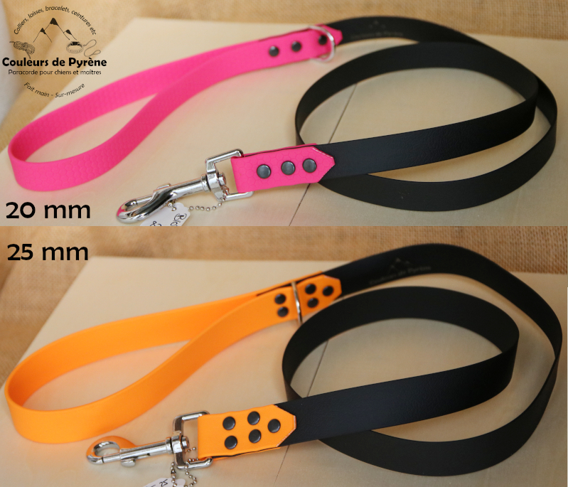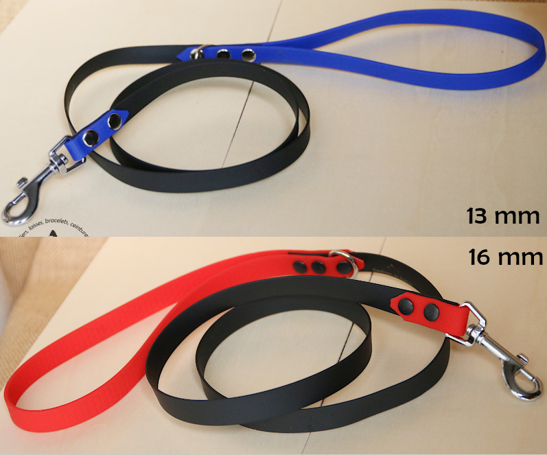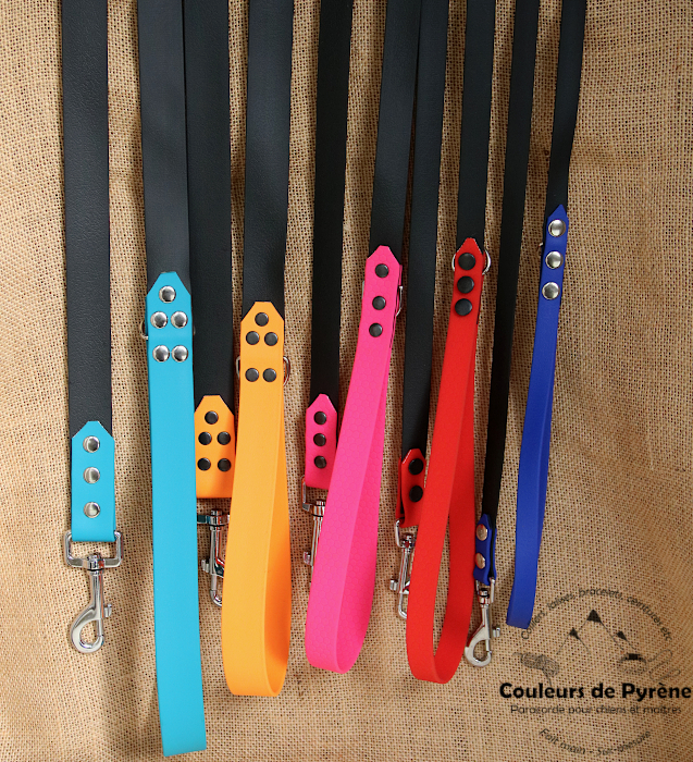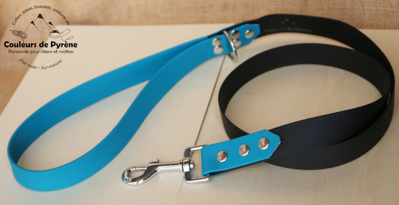La poignée et la zone du mousqueton sont en BIOTHANE colorée, la partie centrale est noire, pour faire ressortir la couleur !