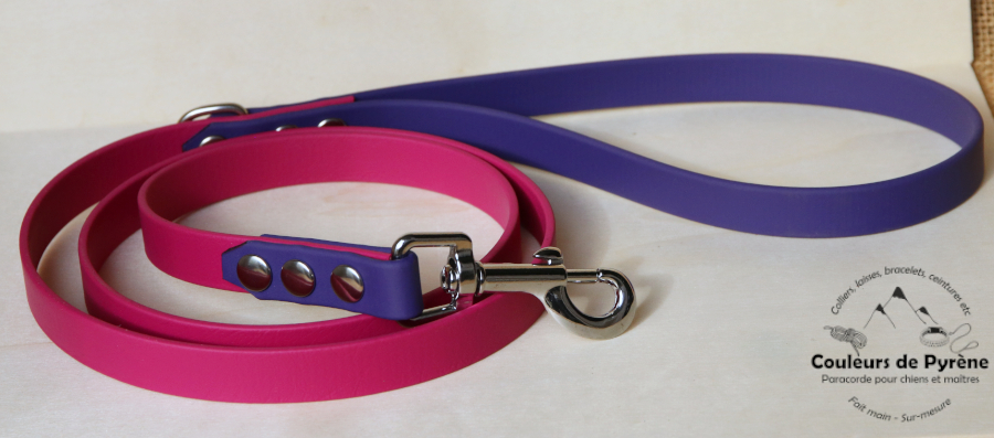 Laisse bicolore en BIOTHANE® 16mm, idéal pour activités outdoor comme la baignade, la chasse, les randonnées et autres balades… La poignée et la zone du mousqueton sont couleur violet et la partie centrale est couleur fuschia.