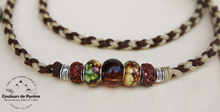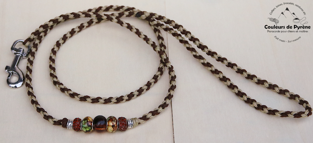 Laisse fine pour expositions canine ou pour petits chiens. Motif MADAMETE (catégorie Mini) en paracorde fine, couleur rose marron et beige.