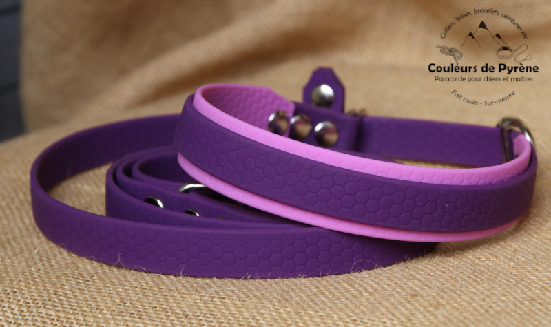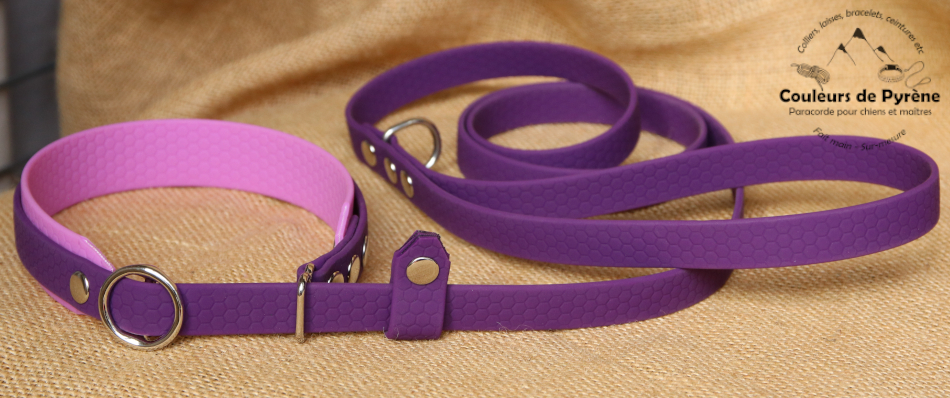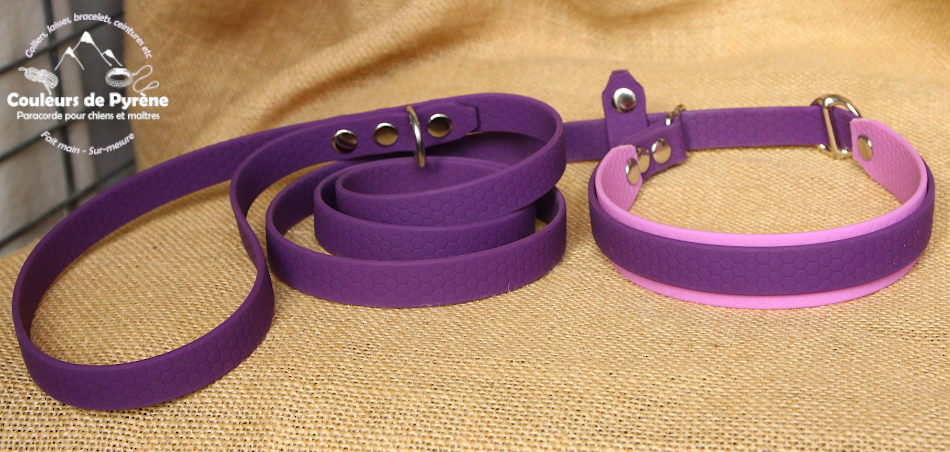 L’ensemble est en BIOTHANE hexa couleur violette, 16mm de large, et la doublure du collier est en BIOTHANE Hexa rose lavande, largeur 25mm.