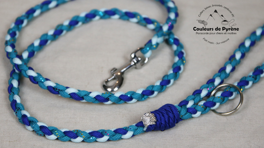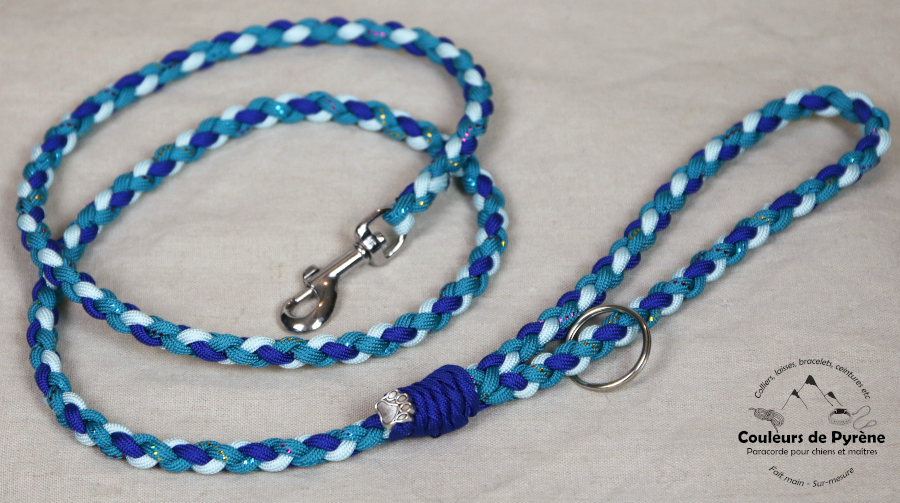 Laisse en paracorde, motif MADAMETE (MINI), couleur bleu et paillettes.