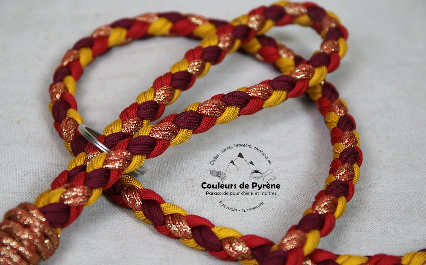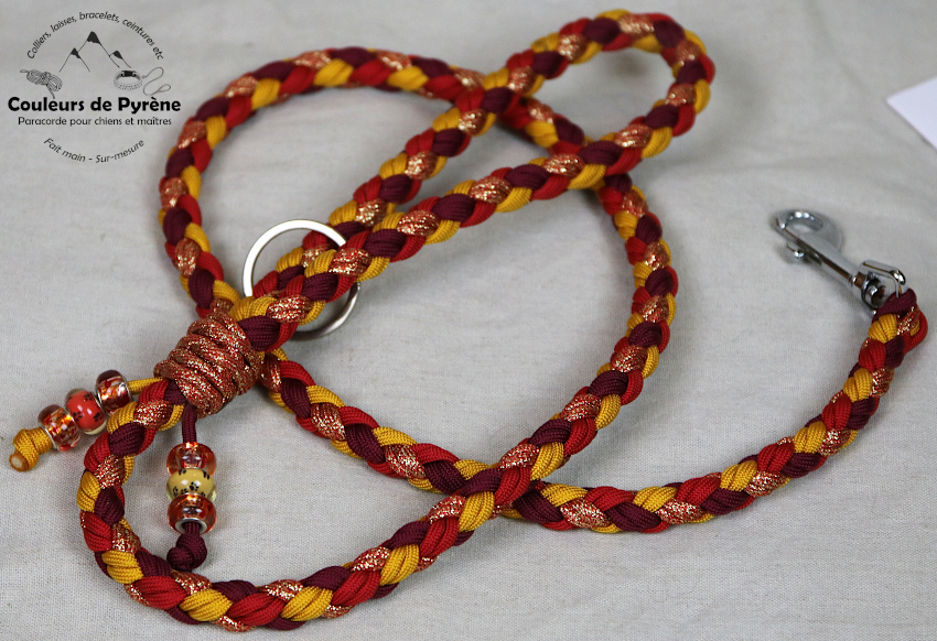 Laisse motif OSSAU (catégorie EXTRA), couleurs camaieu de rouge, jaune, orange et paillettes.
